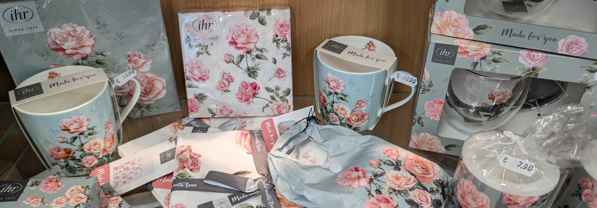 Heute sind aber nochmal unsere neuen schönen Rosen – Zubehör – Produkte in die Zweibrücker Vitrine eingezogen.