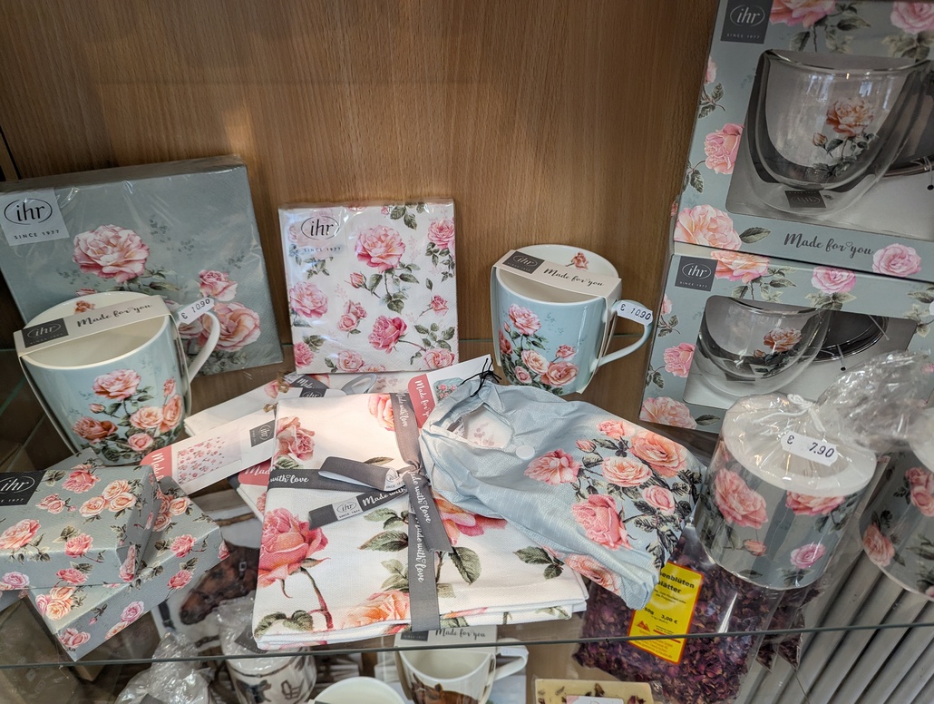 Heute sind aber nochmal unsere neuen schönen Rosen – Zubehör – Produkte in die Zweibrücker Vitrine eingezogen.